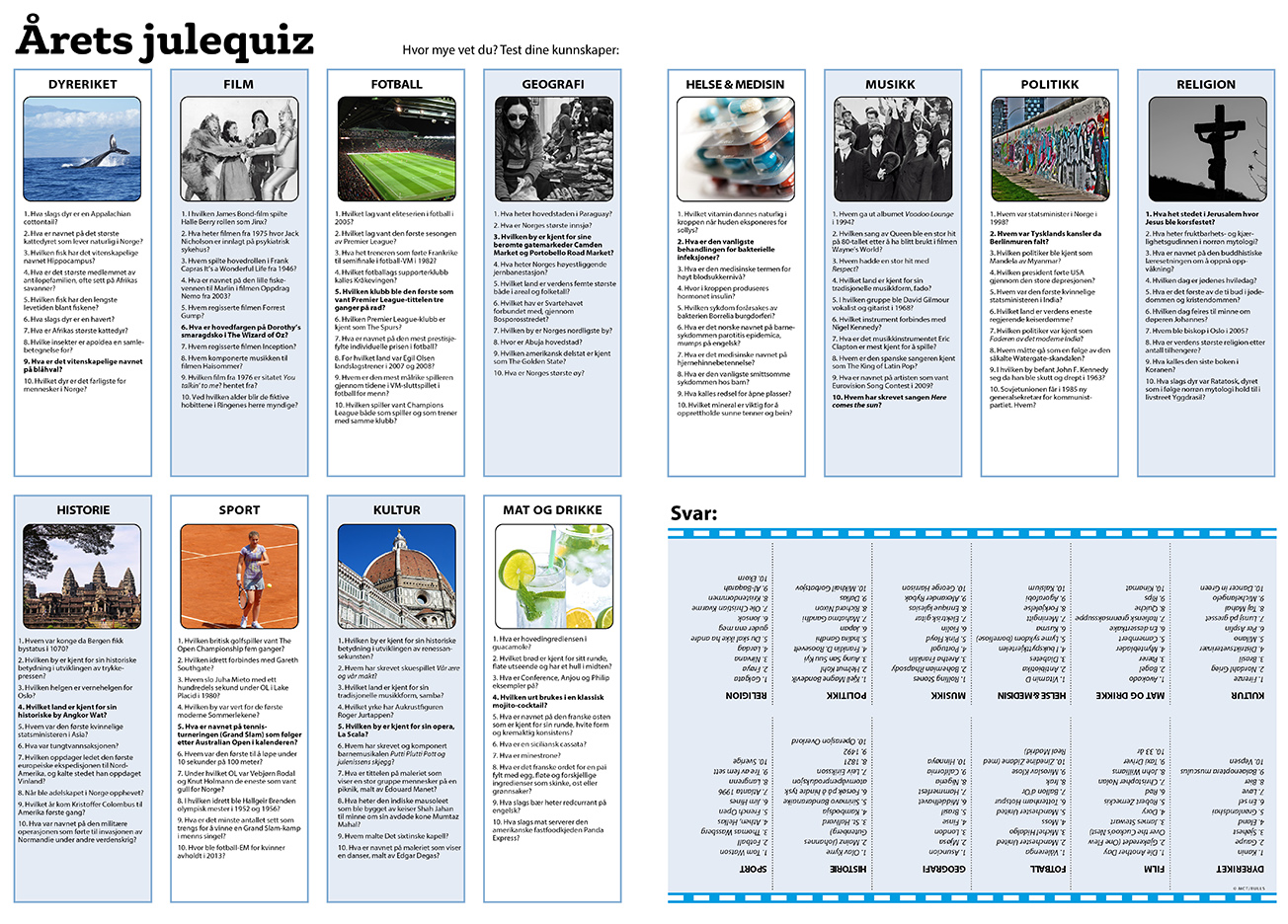 Dobbel tabloidside i farger med spørsmål i ulike kategorier. I julen har man ofte bedre tid enn ellers. Kanskje befinner du deg på hytta og trenger litt underholdning. Eller vil du bare teste egne eller andres kunnskaper med en quiz? Hvis du ønsker å motta spørsmålene som en egen tekstfil og alle bildene, slik at du kan sette opp quizen etter avisens egne maler og fonter, ta kontakt.