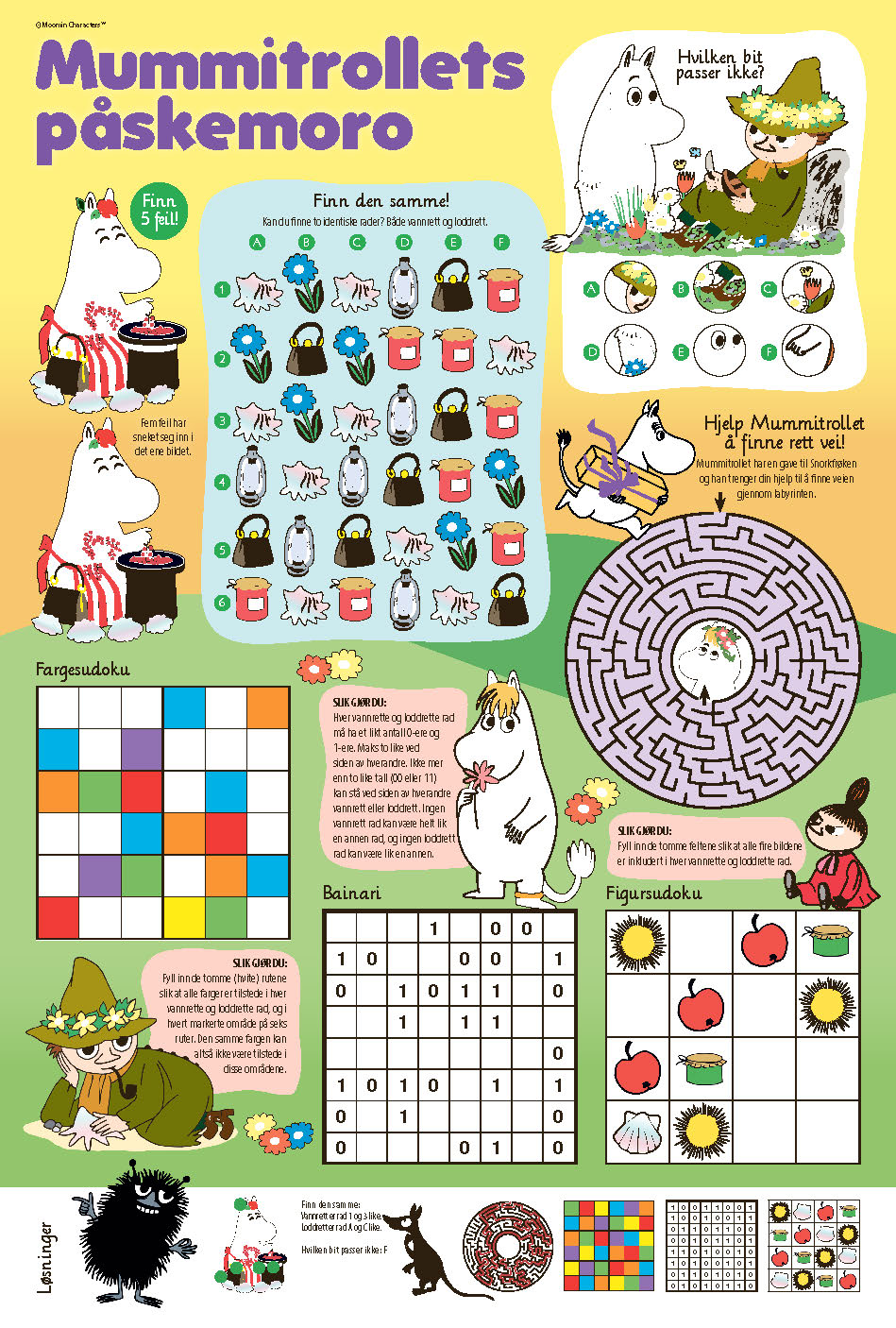 Hel tabloidside i farger, med oppgaver for de minste barna. Løsninger ligger nederst på siden.